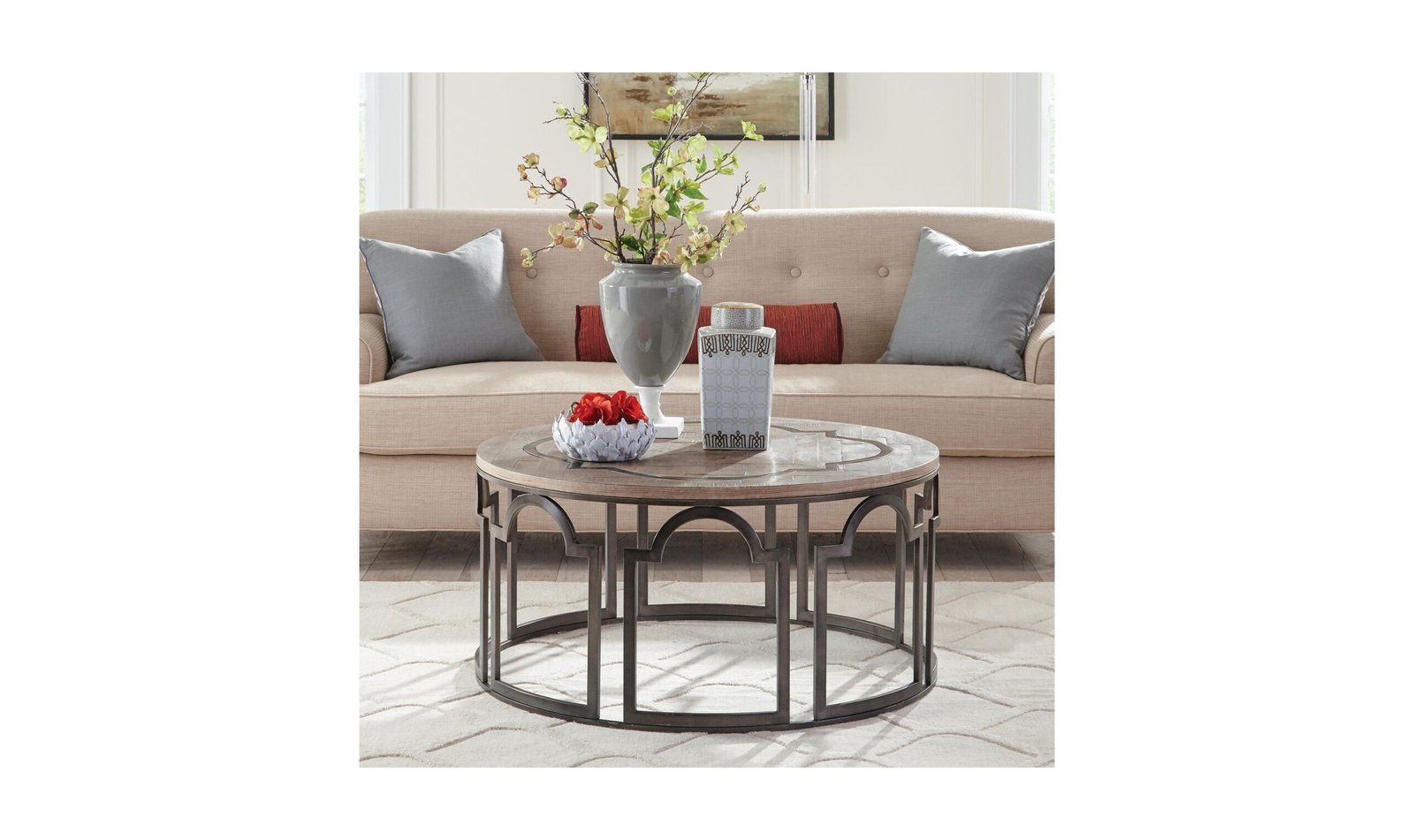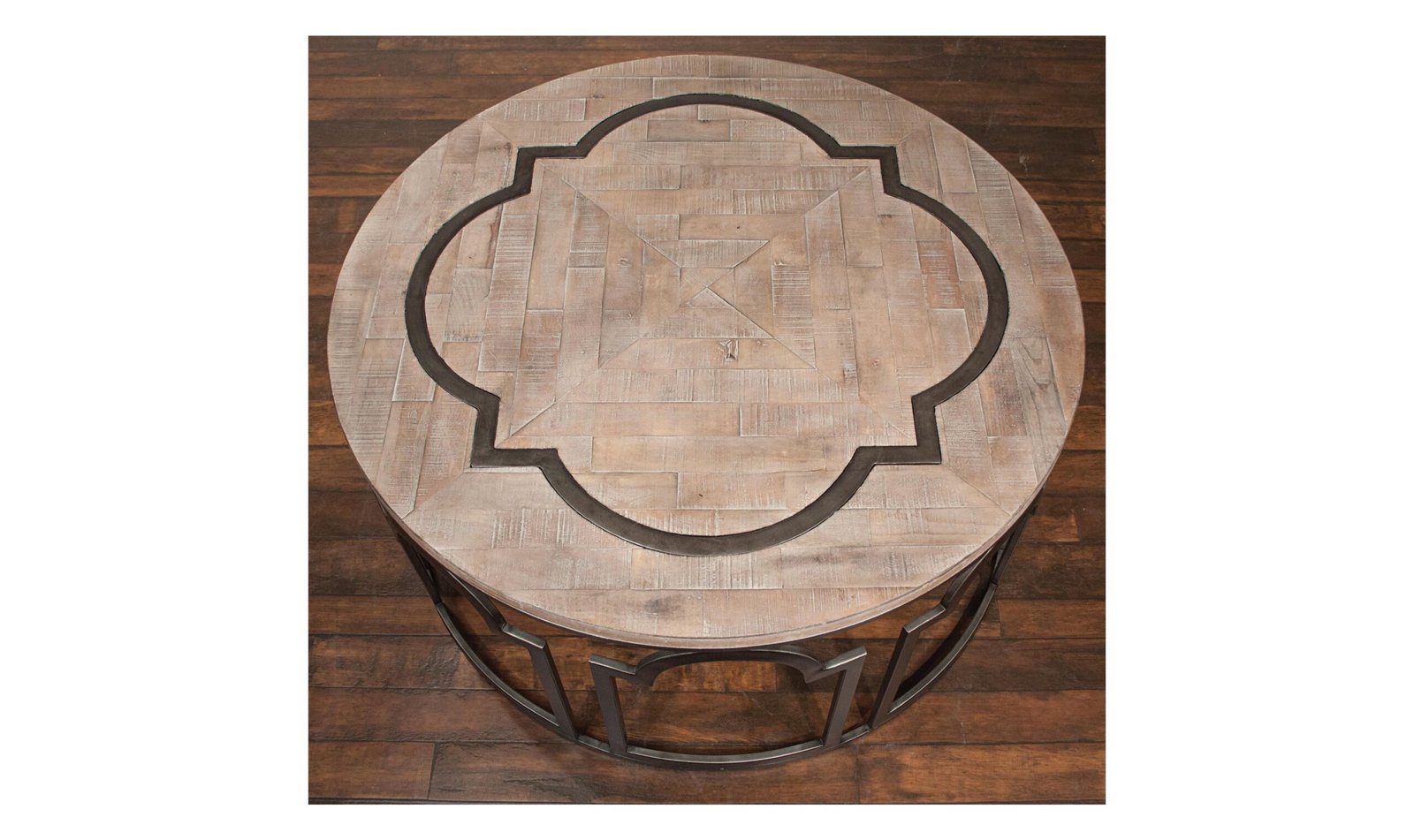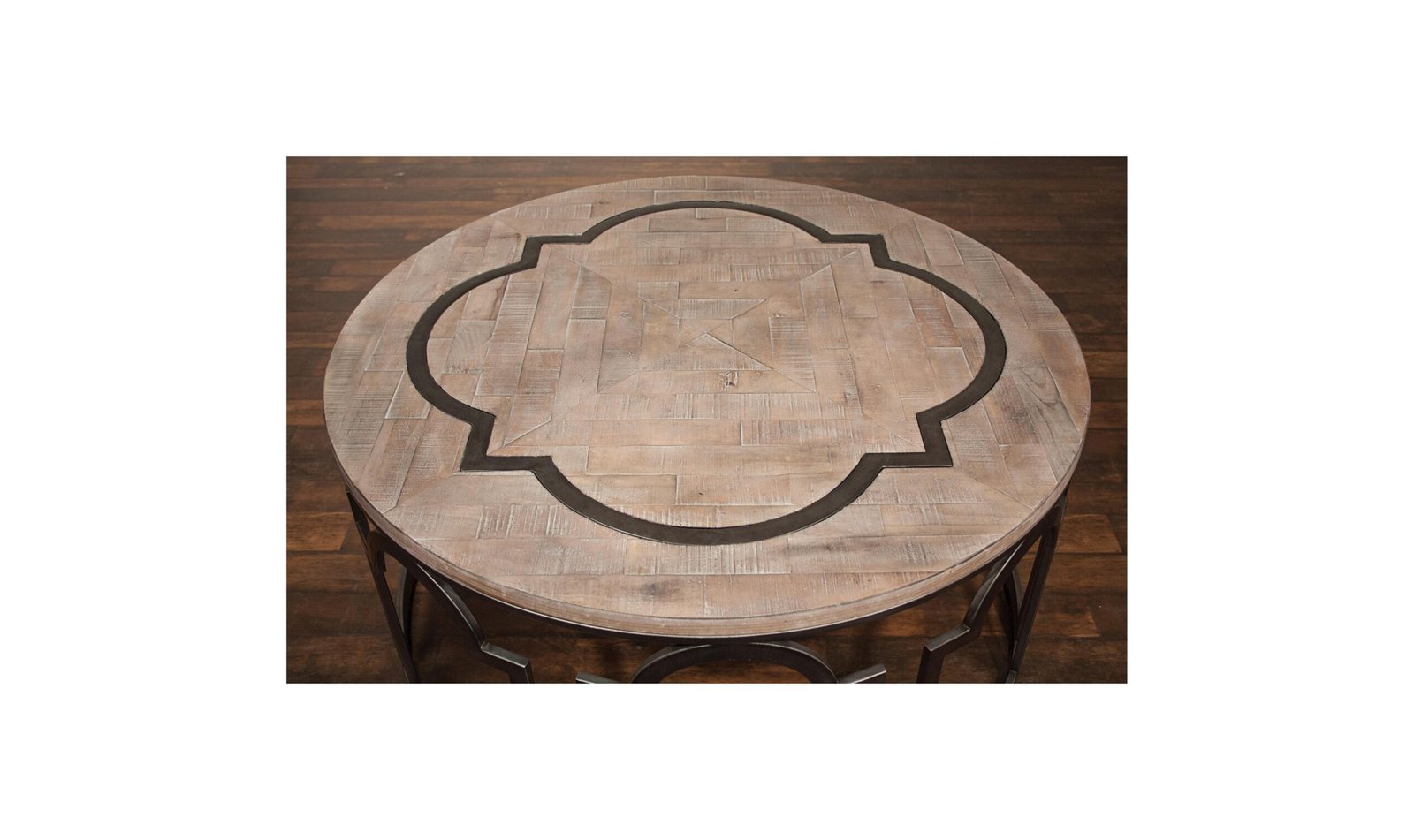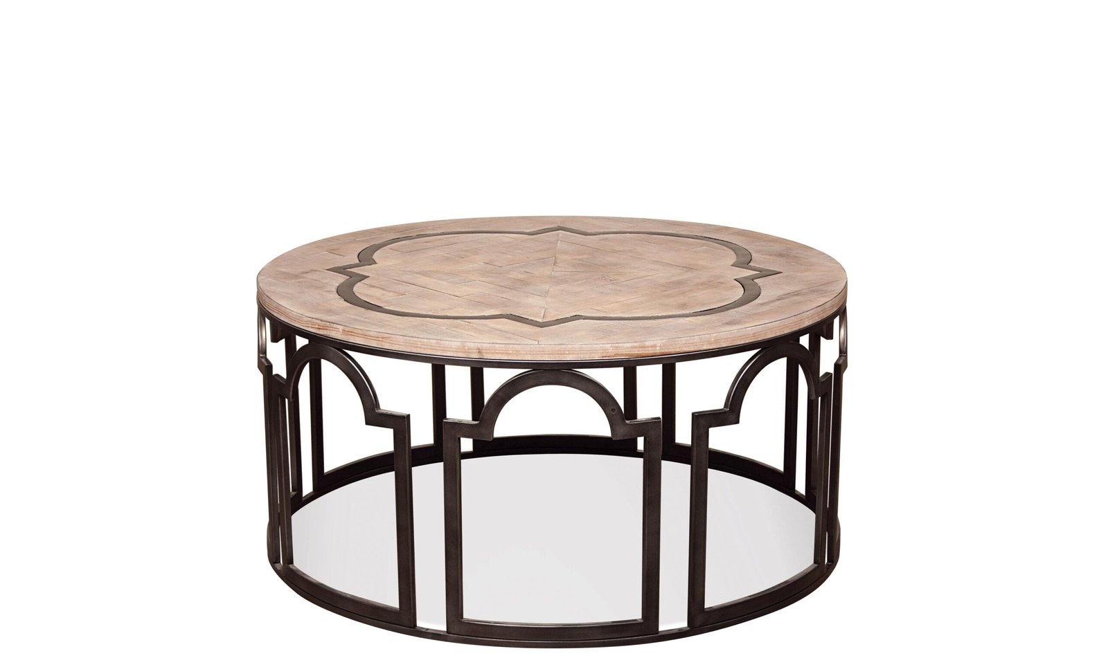 Estelle Round Cocktail Table.Base is made of metal in an ornamental-cut pattern. ….